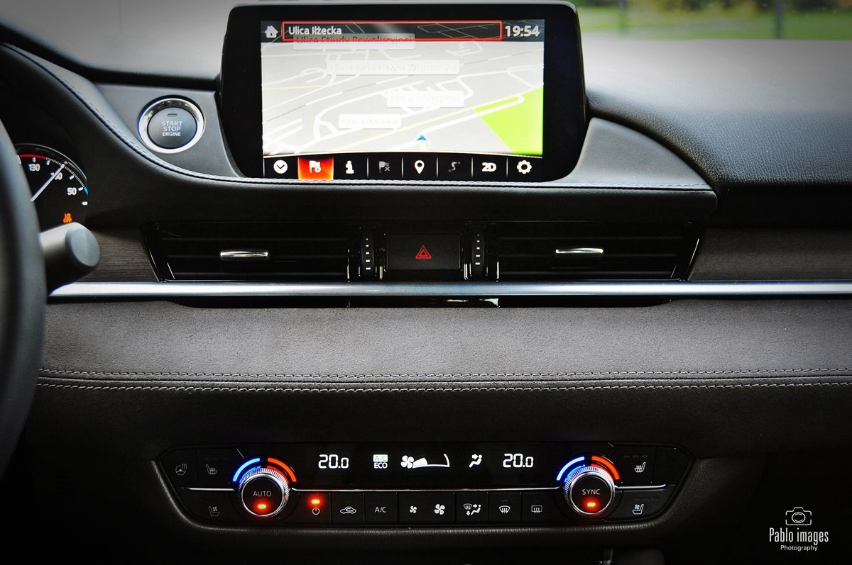 Zatem „Szóstka” to prawdziwy „driver’s car” – samochód dla kierowcy. Inaczej można go nazwać klasycznym sportowym sedanem. Wnętrze wykończone jest jak najprawdziwsze premium, z dbałością o najdrobniejsze szczegóły. Czytelne zegary to połączenie cyfrowego prędkościomierza i otaczających go analogowych: obrotomierza z lewej i wskaźnika poziomu paliwa oraz temperatury z prawej. Do tego wyświetlany wprost na szybie head-up display, bardzo czytelny i pokazujący, poza podstawowymi informacjami, jak prędkość czy znaki drogowe, także ostrzeżenia o pojazdach na sąsiednich pasach.