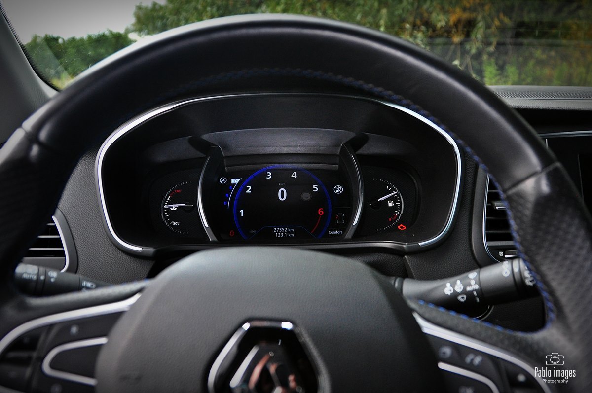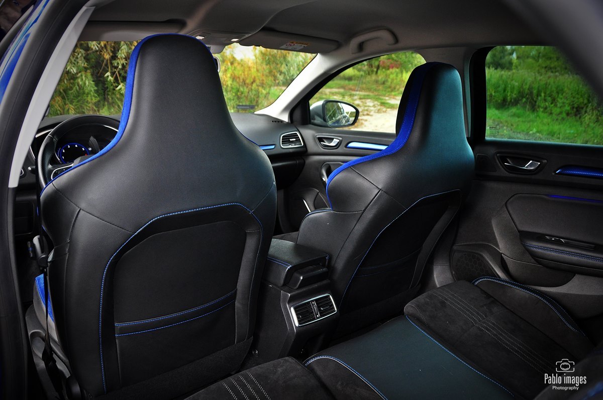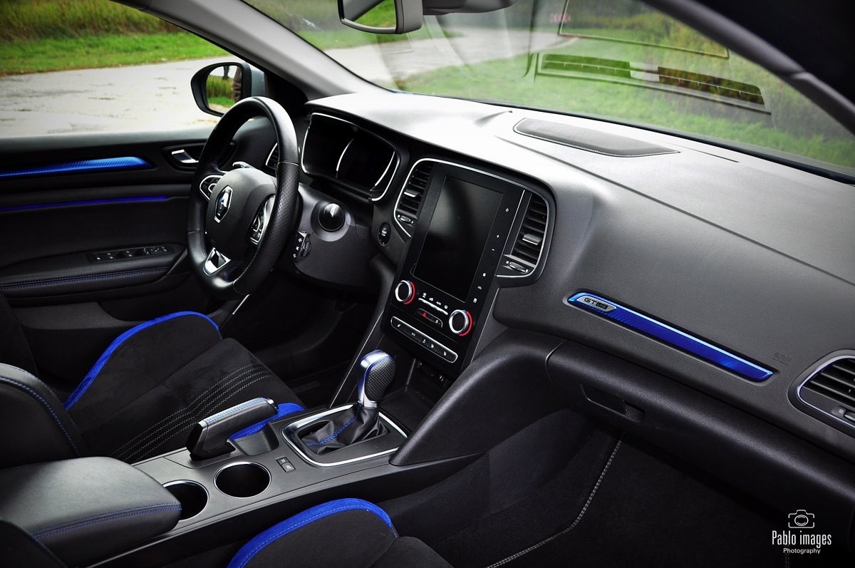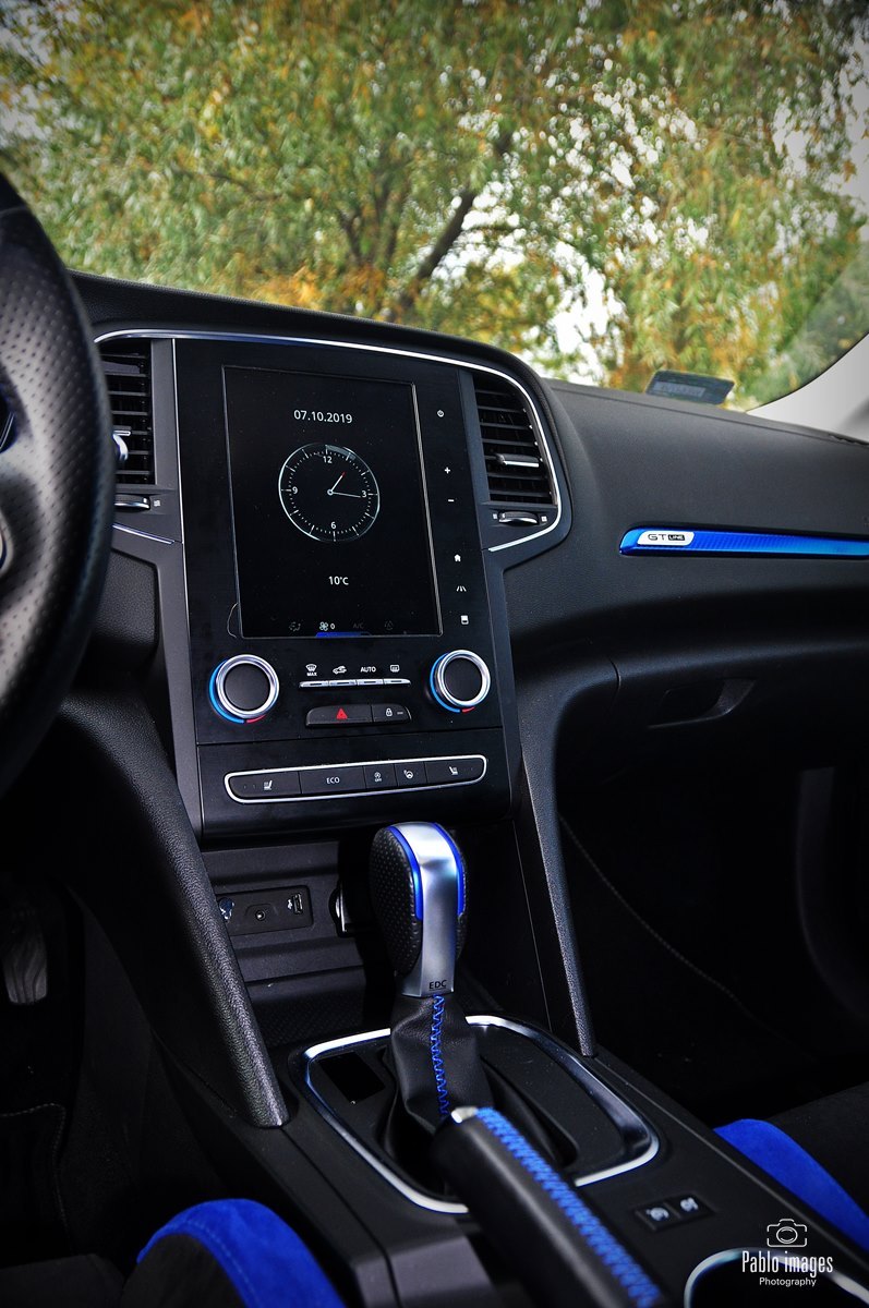 Renault Megane GT-line zatem wyróżnia się wizualnie: sportowe zderzaki, niewielki dyfuzor z tyłu, końcówka rury wydechowej o większej średnicy. Do tego osiemnastocalowe felgi i piękny niebieski lakier. Wewnątrz w oczy rzucają się przede wszystkim opcjonalne sportowe fotele, faktycznie niemal takie, jak te w prawdziwym RS. Pokryte są alcantarą, mają ozdobne niebieskie wstawki – to zresztą kolor mocno akcentowany wewnątrz: przeszycia, wstawki na desce i drzwiach, nawet podświetlenie. Same fotele są bardzo mocno wyprofilowane, z wysokim oparciem i stałym zagłówkiem. Naprawdę doskonale się w nich siedzi, kierowca czuje, jak samochód „otacza” go dając pełną kontrolę. Jedyna wada to skokowa regulacja oparcia. Niewygodna i średnio dokładna, w roku 2020 już po prostu denerwująca. Renault jednak trzyma się jej z uporem godnym lepszej sprawy.