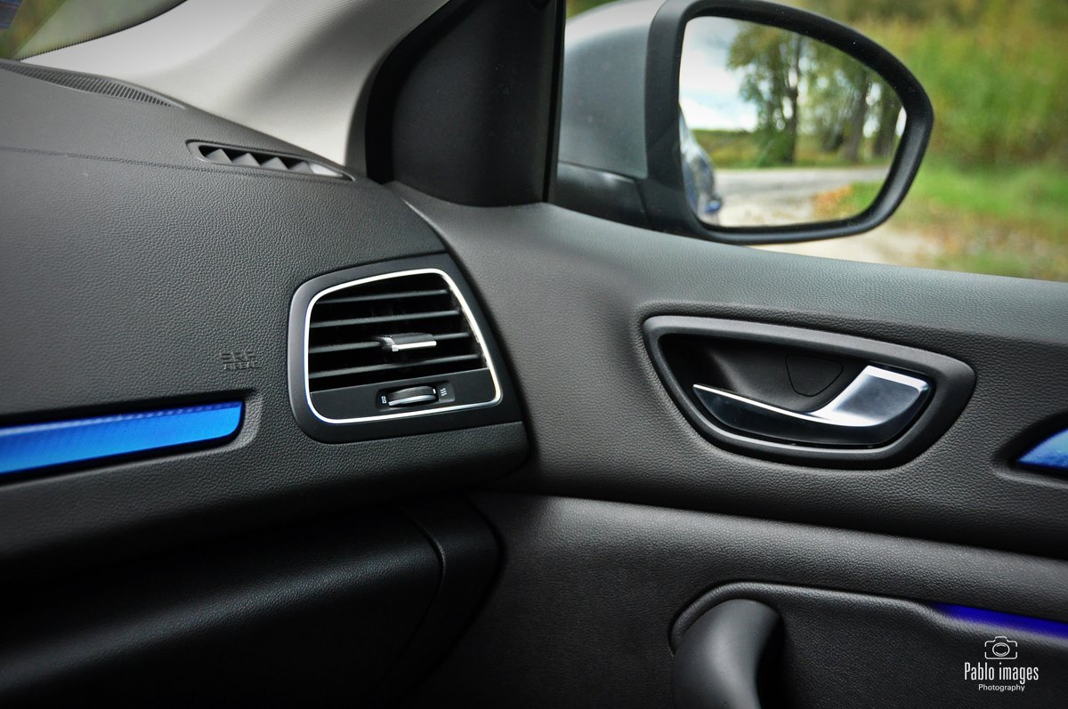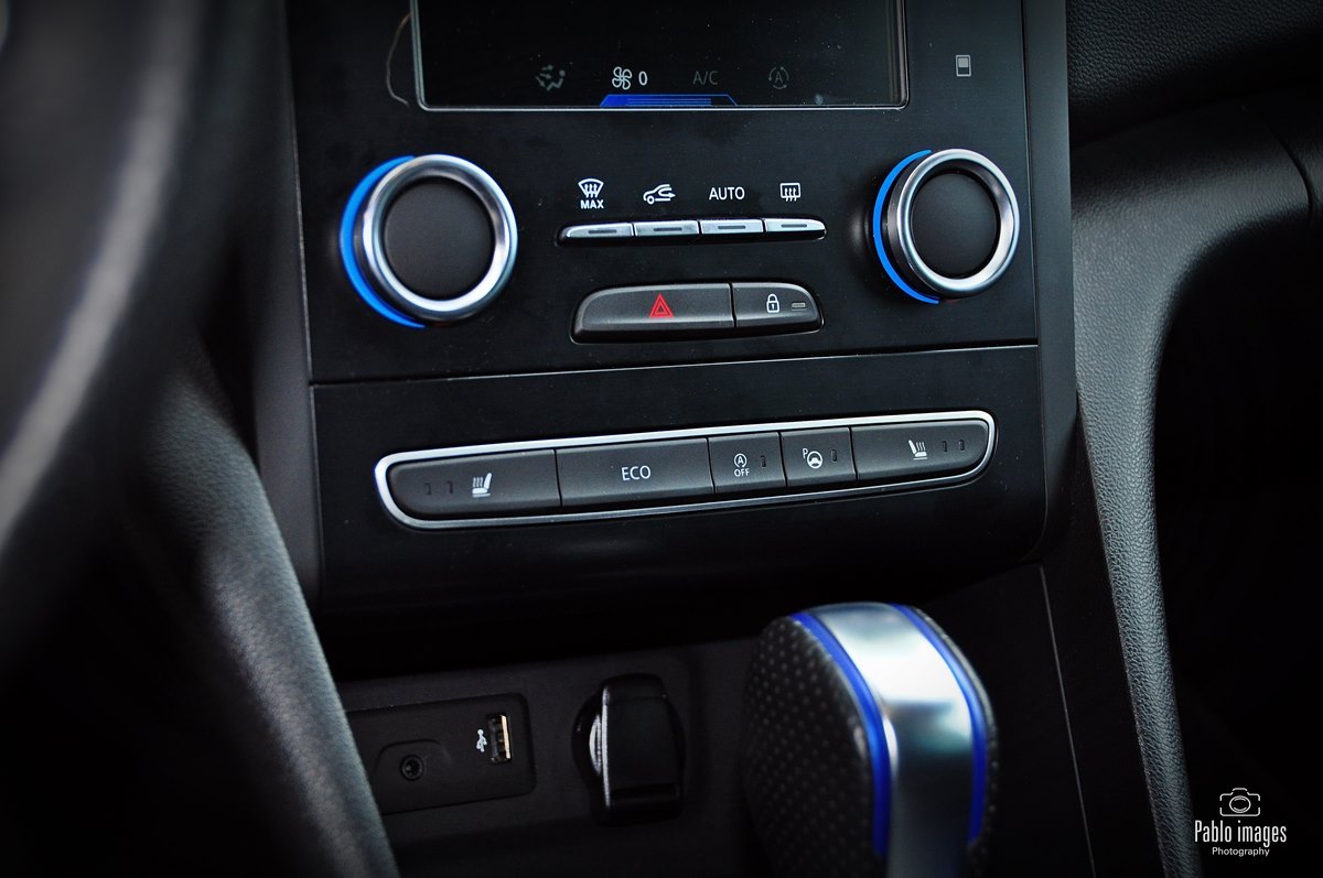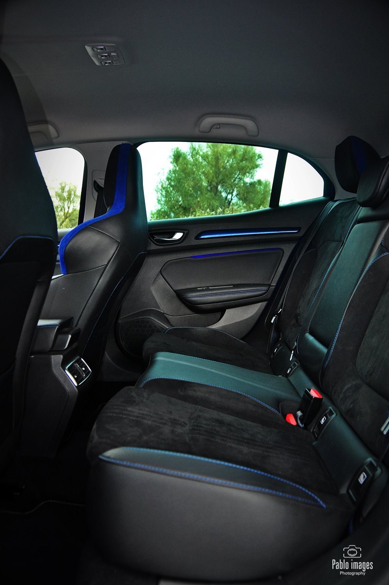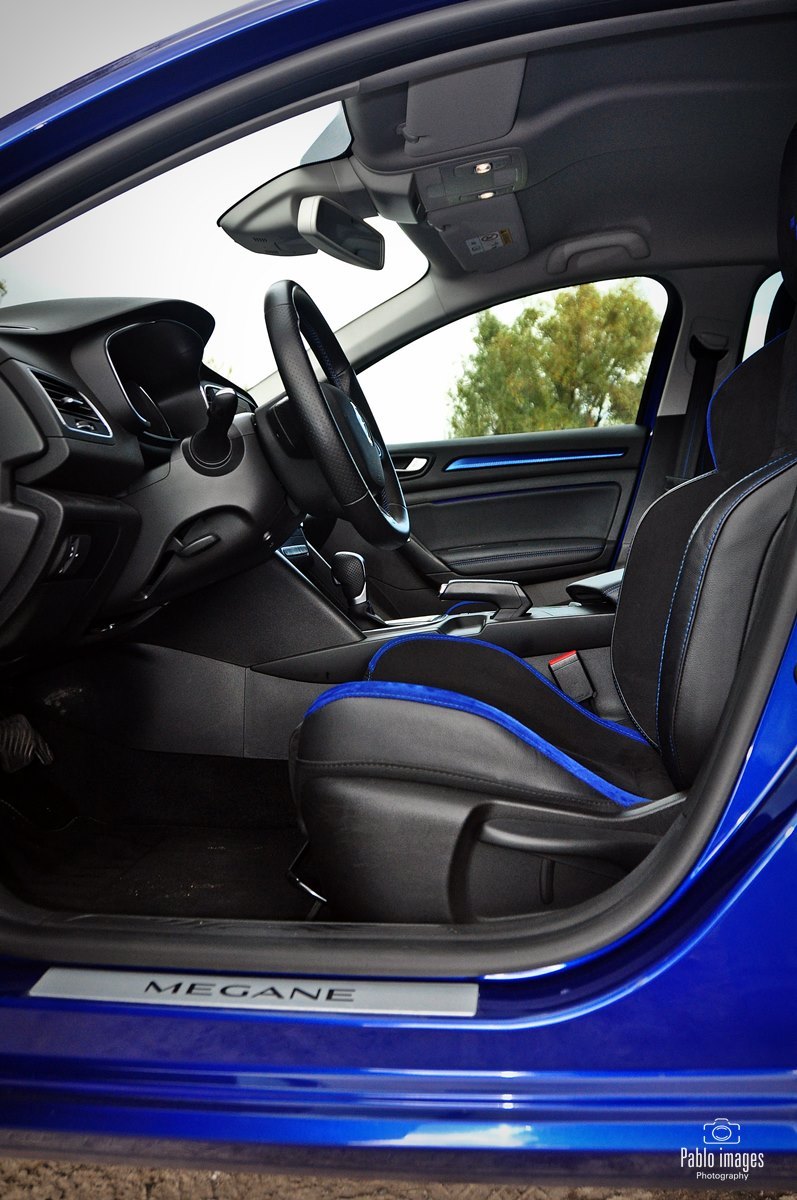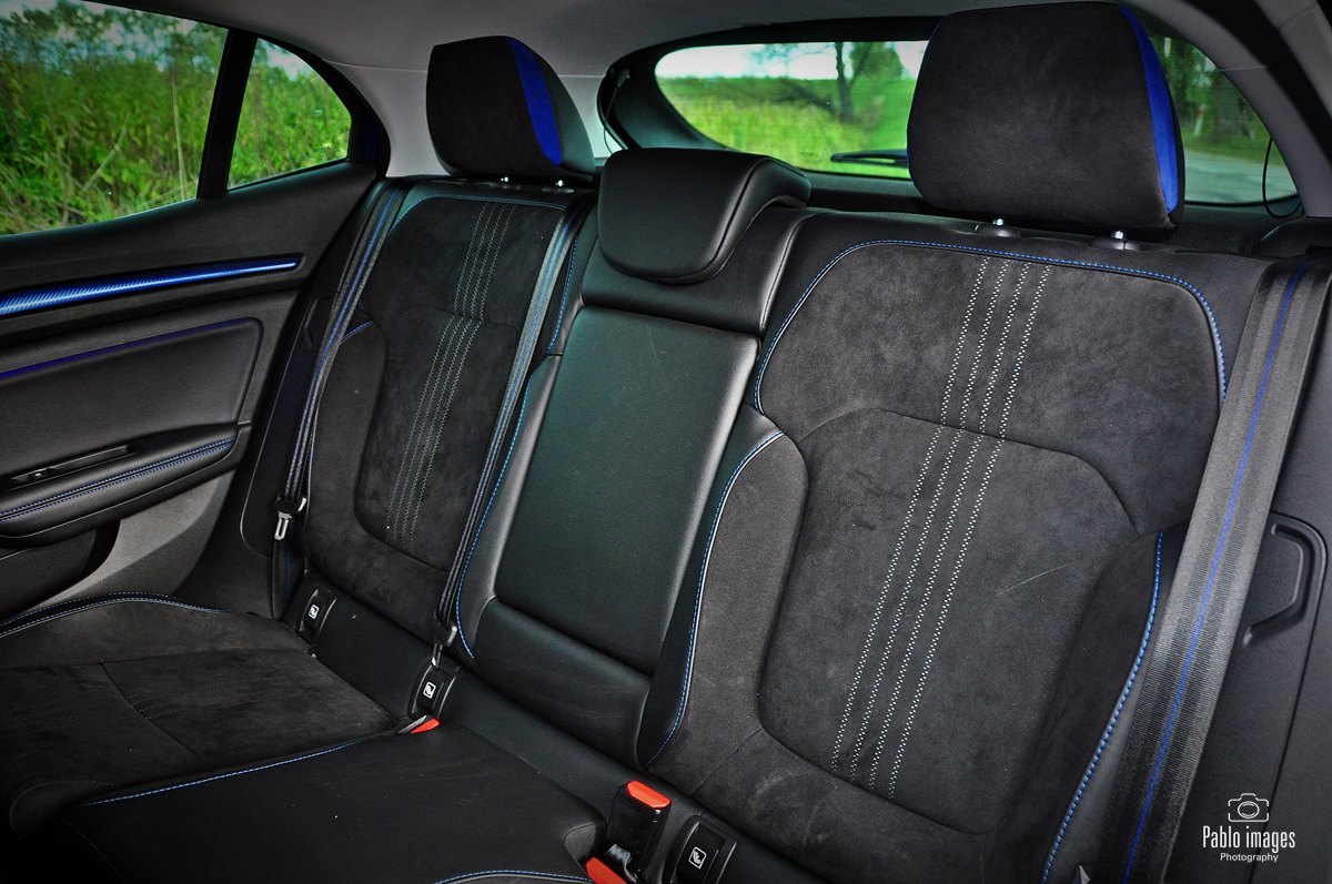 Renault Megane GT-line zatem wyróżnia się wizualnie: sportowe zderzaki, niewielki dyfuzor z tyłu, końcówka rury wydechowej o większej średnicy. Do tego osiemnastocalowe felgi i piękny niebieski lakier. Wewnątrz w oczy rzucają się przede wszystkim opcjonalne sportowe fotele, faktycznie niemal takie, jak te w prawdziwym RS. Pokryte są alcantarą, mają ozdobne niebieskie wstawki – to zresztą kolor mocno akcentowany wewnątrz: przeszycia, wstawki na desce i drzwiach, nawet podświetlenie. Same fotele są bardzo mocno wyprofilowane, z wysokim oparciem i stałym zagłówkiem. Naprawdę doskonale się w nich siedzi, kierowca czuje, jak samochód „otacza” go dając pełną kontrolę. Jedyna wada to skokowa regulacja oparcia. Niewygodna i średnio dokładna, w roku 2020 już po prostu denerwująca. Renault jednak trzyma się jej z uporem godnym lepszej sprawy.