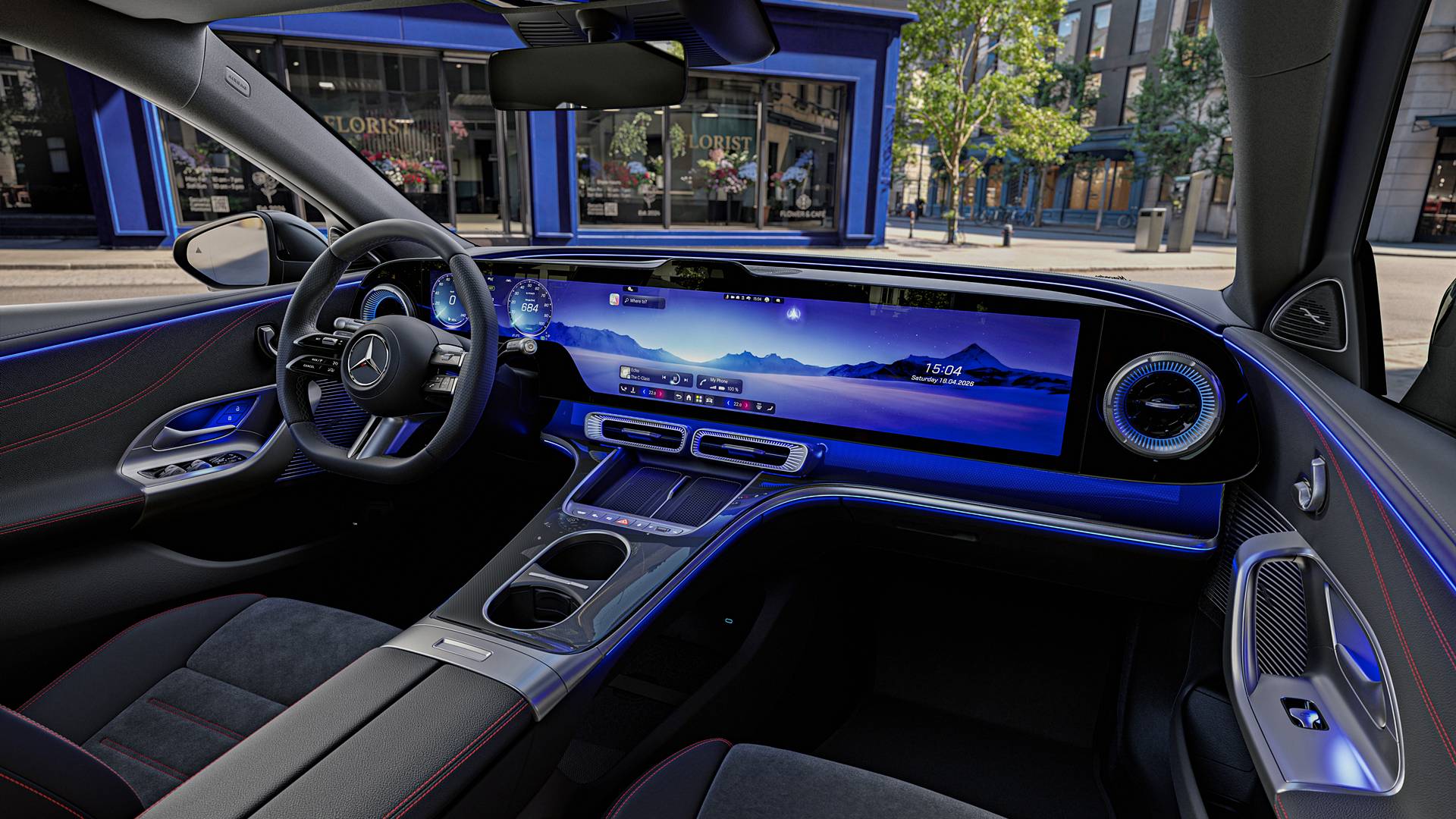 Duży element dekoracyjny łączy konsolę środkową z deską rozdzielczą w jedną harmonijną całość. Opcjonalny MBUX Hyperscreen lub MBUX Superscreen tworzy immersyjne wrażenie przestrzeni. Technologia matrycowego podświetlenia z prawie dziesięcioma milionami pikseli i niezależnie regulowanymi strefami jasności wyświetla wyraźne informacje dla kierowcy oraz także spersonalizowaną rozrywkę dla pasażera.